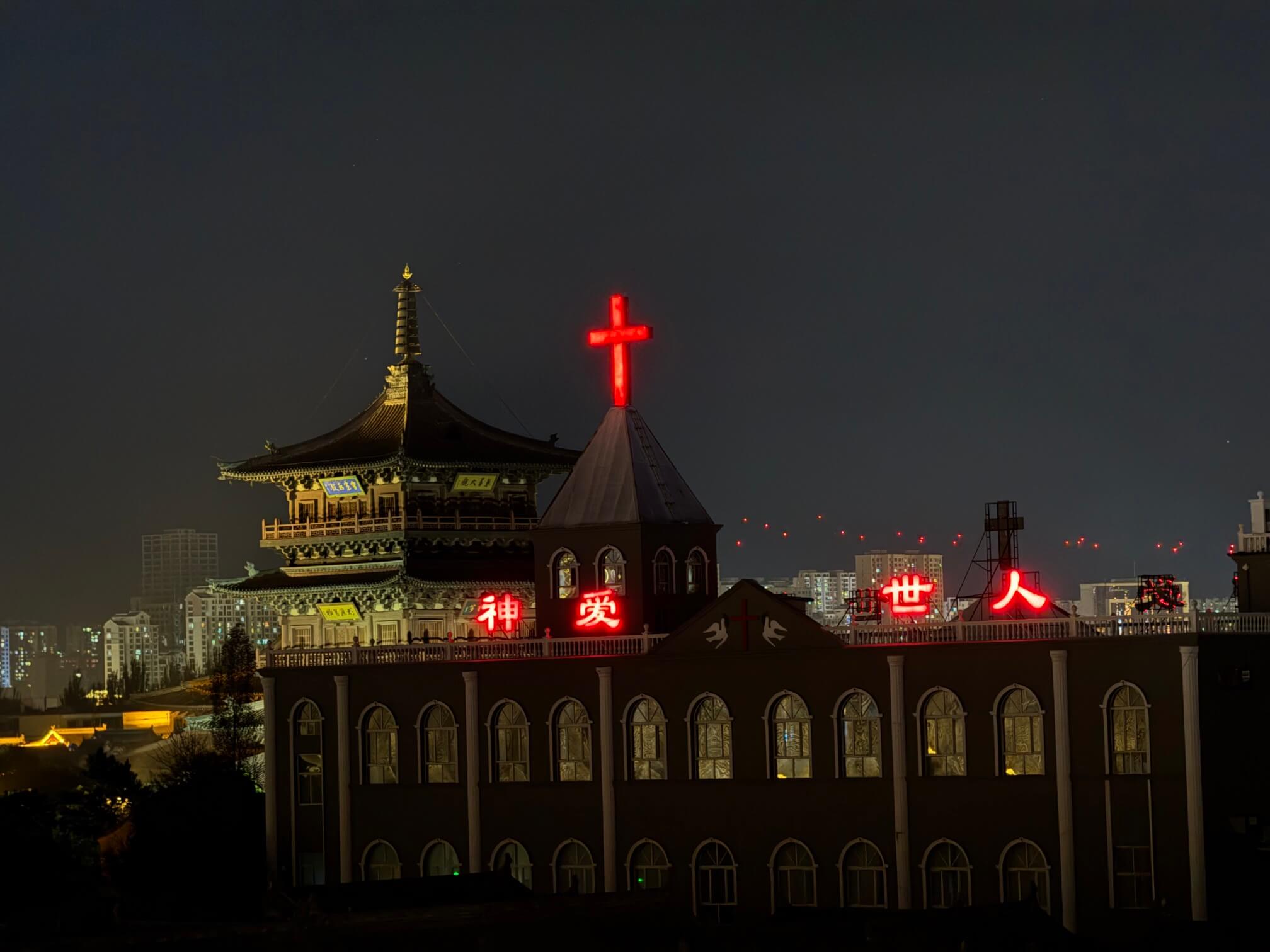 大同古城里短短几步的距离就有华严寺这座佛教寺庙,导游告诉我们里边许多庙有游牧民族的风格融合在里边:他们的建筑不会坐北朝南,而是东西走向让一整天都有阳光照进来。古城商业街旁有个道观,而道观的旁边就是回族伊斯兰教的清真大寺。波斯语的赞歌像画一样拼成方形,竖排着刻在牌坊上,像汉文化的对联一样。从大同往外走,悬空寺也是一个三教合一的寺庙。我和 MX 开玩笑说:“这不就是咱中国人自己的联合教堂嘛!” 晚上再回到大同的古城,在城墙上遛弯时,华严寺的佛塔旁是一个耀眼的红色的十字架,旁边还有几个同样耀眼的红色大字,“神爱世人”……